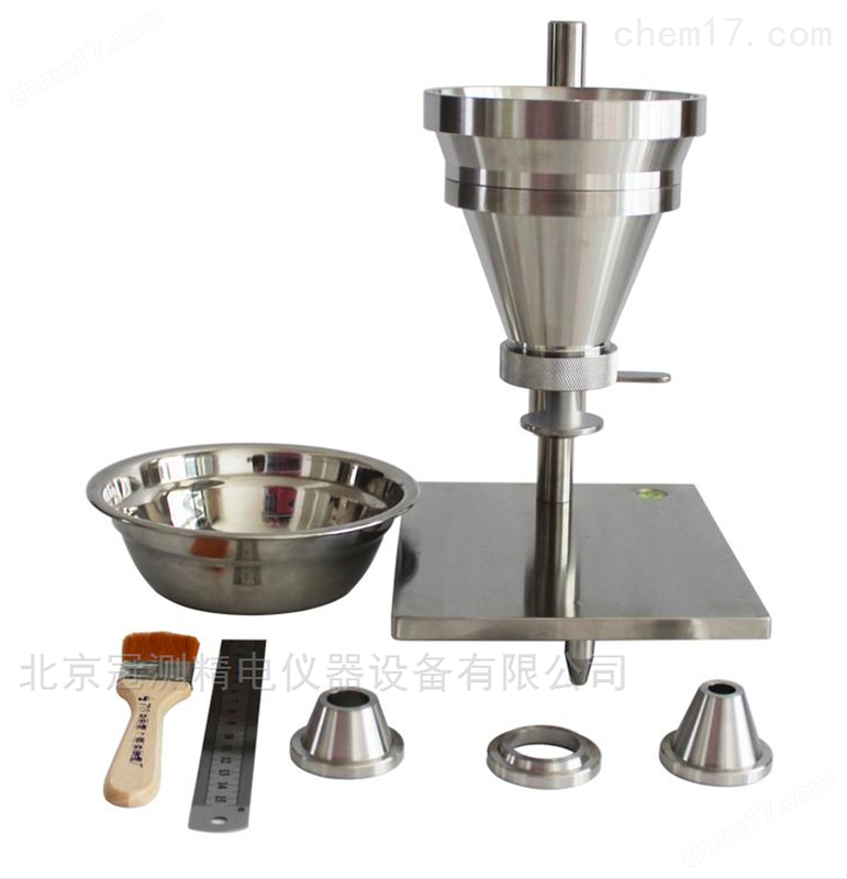 1.用關閉裝置封閉漏斗出口,向漏斗內倒入(150士1)g試料,試料應沿漏斗內壁倒人,以防壓實迅速打開關閉裝置,但不要引起振動,同時開始計時,當漏斗空了的時候,即從漏斗的頂部一看到漏斗的出口就停止計時,讀取流出時間,精度要達到0.1S
