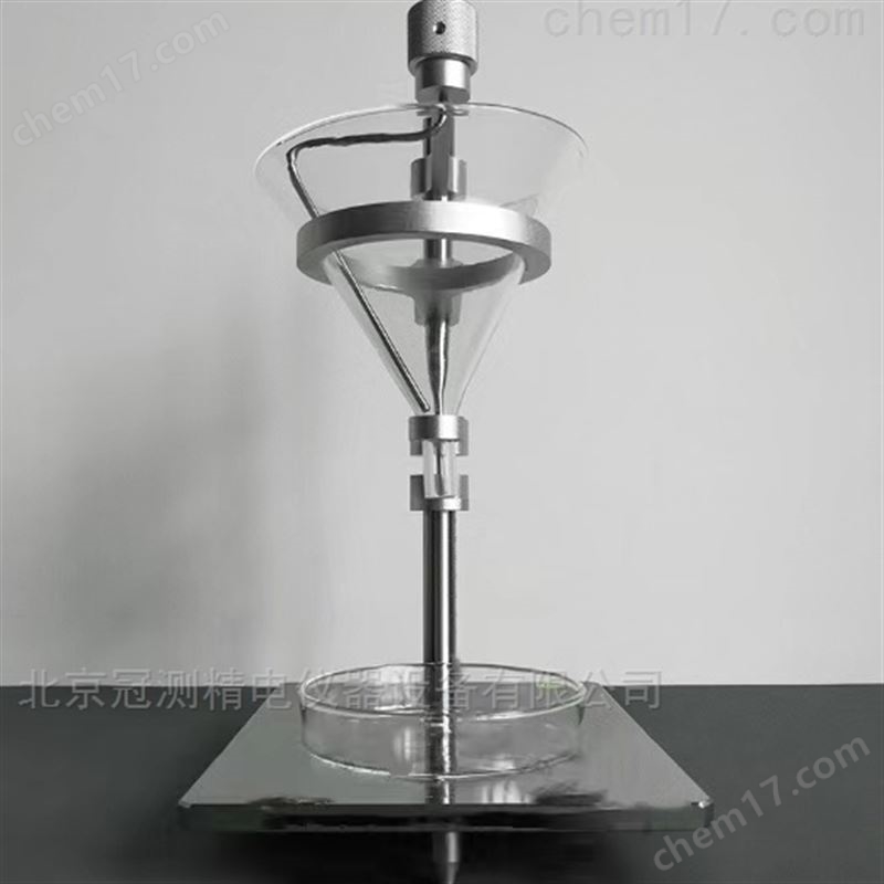 測試粉末和顆粒通過進料漏斗后再流入到測試漏斗中再自動流出堆積,解決粉末和顆粒因加料時產品本身重力和內摩擦對粉末和顆粒自然流出之影響,得出數據更加真實反映產品本身的特性;如果粉體的流動性很差而不能流出時,加入100μm的玻璃球助流,助流劑的選擇應該根據產品的實際特性選擇,測定自由流動所需玻璃球的最少加入量,加入量越多流動性越差.