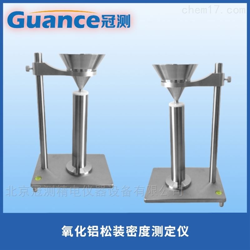 松裝密度儀測定步驟1、試料:取GB/T 6609.23中3.2中的原始試樣,在300℃±25℃保溫2h后冷卻。2、測定:將圓筒形容器干燥后置于底臺上,調節漏斗使其中心線與圓筒中心線相重合,并使漏斗下端面與圓筒形容器頂部平面距離為10mm。將試料從距離漏斗上方約40 mm處往漏斗中心自由流入,使整個裝置無振動,下料流量為20 g/min~60 g/min,如果漏斗